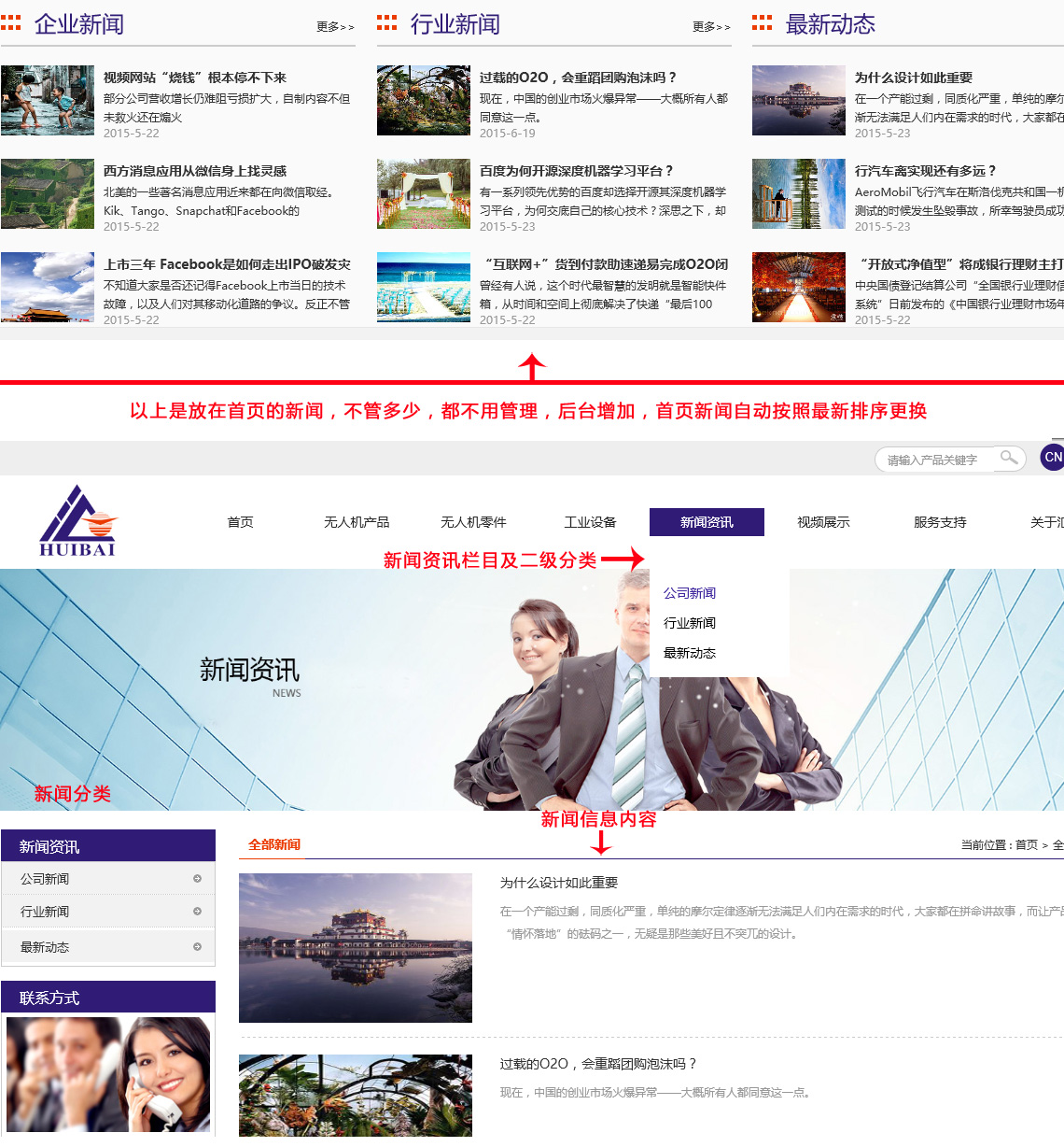 新聞資訊一般分為首頁新聞、新聞分類和內頁新聞三部分,首頁新聞一般無需設置,不像首頁公司簡介一樣,還需在零碎信息管理里面單獨修改,新聞在后臺自動添加新增后,首頁新聞自動增加,首頁新聞一般是依據最新添加排在前面;至于新聞分類和內頁新聞主要是對應后臺左側新聞分類(管理分類,添加分類)、新聞管理(管理信息、添加信息)兩個欄目,添加新聞的一般順序是先規劃好新聞資訊欄目下的二級分類,比如企業新聞、行業新聞、展會新聞、產品新聞等,優先規劃好二級分類才好在添加新聞時進行分類選擇,否則優先添加新聞,再進行分類,然后再點擊新聞進行修改分類,多此一舉;